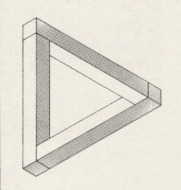 Se le llama el "triángulo imposible" y fue inventado por Lionel S. Penrose y R. Penrose del University College de Londres. Si se observa la figura se verá que cada uno de sus ángulos es posible pero el conjunto es imposible.